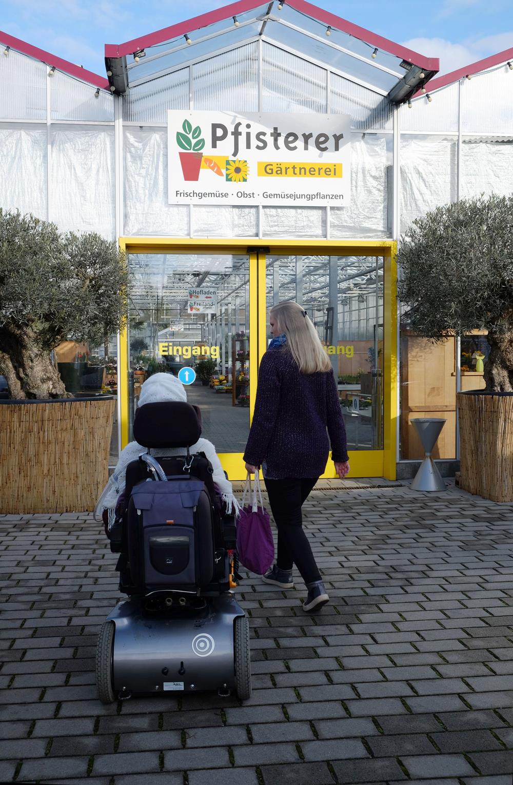 Zwei Frauen, eine davon im Rollstuhl laufen auf eine Gärtnerei zu. (Ulrike Seifart)