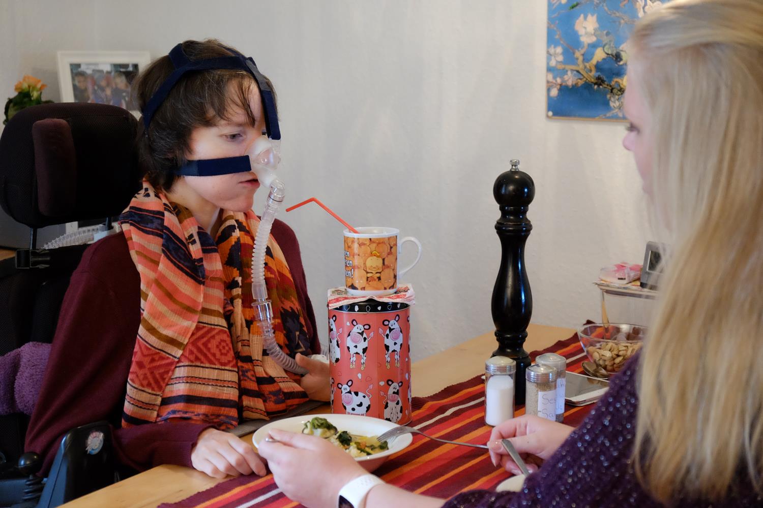 Eine Frau mit Behinderung im Rollstuhl mit Atemmaske beim Essen (Ulrike Seifart)