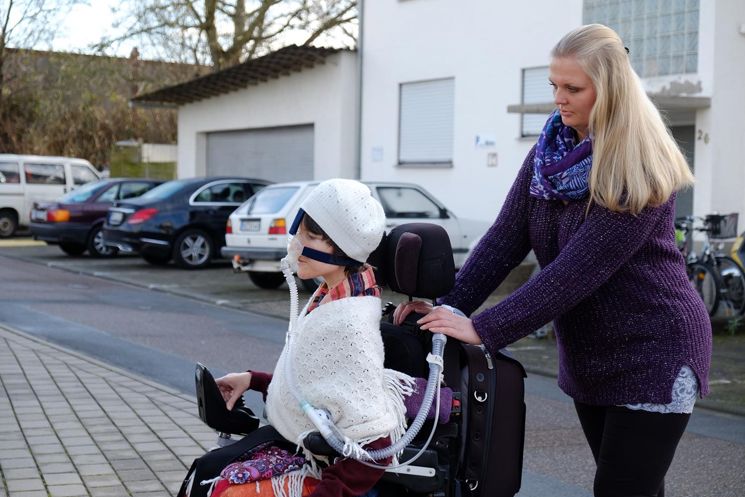 Eine Frau schiebt eine Frau mit Behinderung im Rollstuhl mit Atemmaske. (Ulrike Seifart)