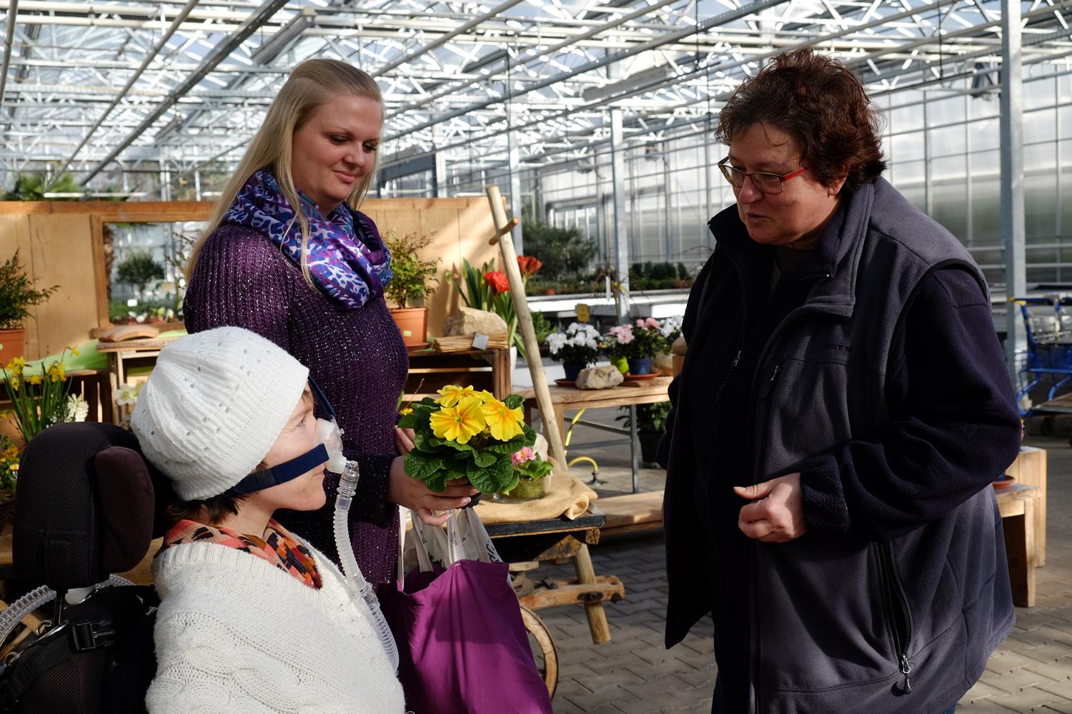 Drei Frauen in einer Gärtnerei, eine sitzt im Rollstuhl. (Ulrike Seifart)