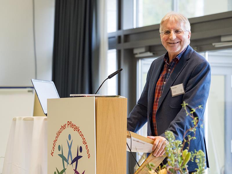 Der Theologe und spirituelle Begleiter Pierre Stutz nahm in seinem Vortrag die Pflegenden selbst in den Blick. Gerade diese Berufsgruppe müsse auch für sich selbst sorgen. Möglich sei das beispielsweise mit der Etablierung von eigenen kleinen Ritualen in den Alltag. Stutz plädierte für den Mut, nicht immer nur "in echt" zu denken, sondern Gelassenheit zu suchen und für sich zu beanspruchen.
