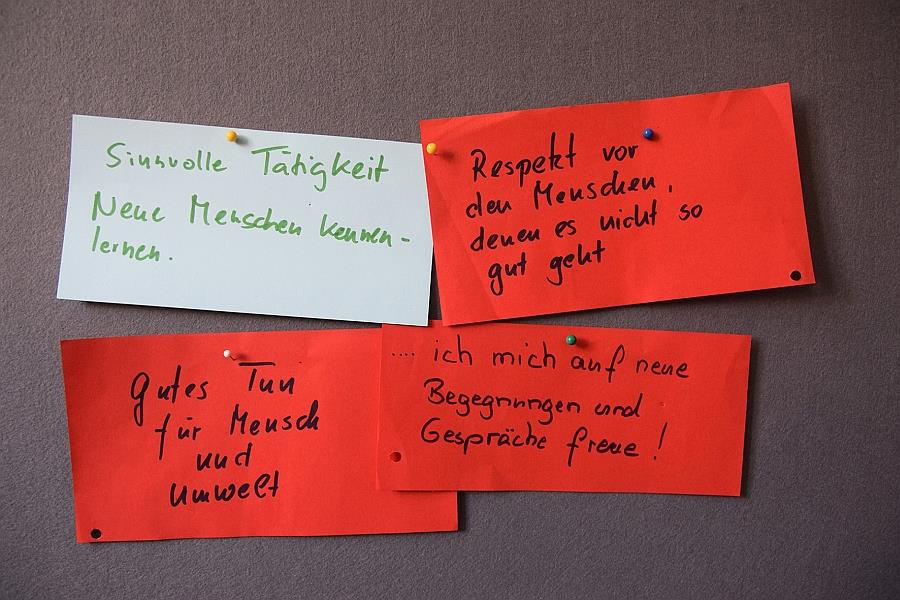 Arbeitsergebnisse an einer PinwandWarum engagiere ich mich? Die Motive sind unterschiedlich, aber eines vereint doch alle Antworten, die beim Vorbereitungstreffen eingesammelt wurden: Für sich und andere Gutes tun.Veronika Klum
