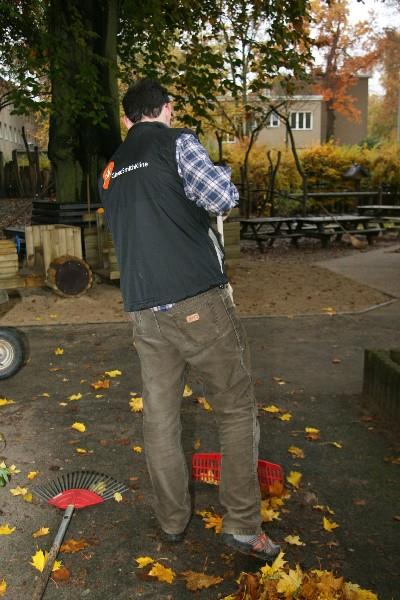 Während die Kleinen noch frühstücken, machen sie sich mit Laubbesen, Schubkarren und Harken bewaffnet an die Arbeit. Das Laub auf dem 4500 qm großen Grundstück muss zusammengefegt, Hecken und Büsche beschnitten und Beete geharkt werden. Nach dem Frühstück helfen die Kleinen mit ihren kleinen Harken und Schubkarren eifrig mit. "Alleine ist die Arbeit auf diesem großen Grundstück kaum zu schaffen", sagt Gabriele Breidbach, Leiterin der Kindertagesstätte und seit 20 Jahren dort tätig. "Wir sind der Firma GlaxoSmithKline wirklich sehr dankbar."