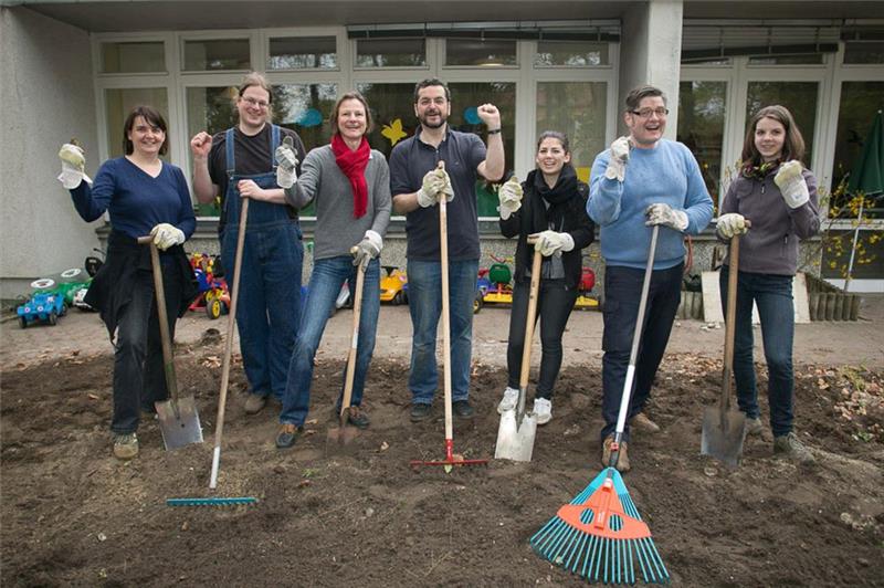 Beim sozialen Tag in der KitaSt. Hildegard tauschten die Mitarbeiter den Bürostuhl gegen den Spaten und halfen beim Frühjahrsputz im Garten. Vom Hauptgeschäftsführer Dr. Paul Kriegelsteiner bis hin zur Schülerpraktikantin waren viele Kolleginnen und Kollegen tatkräftig dabei.